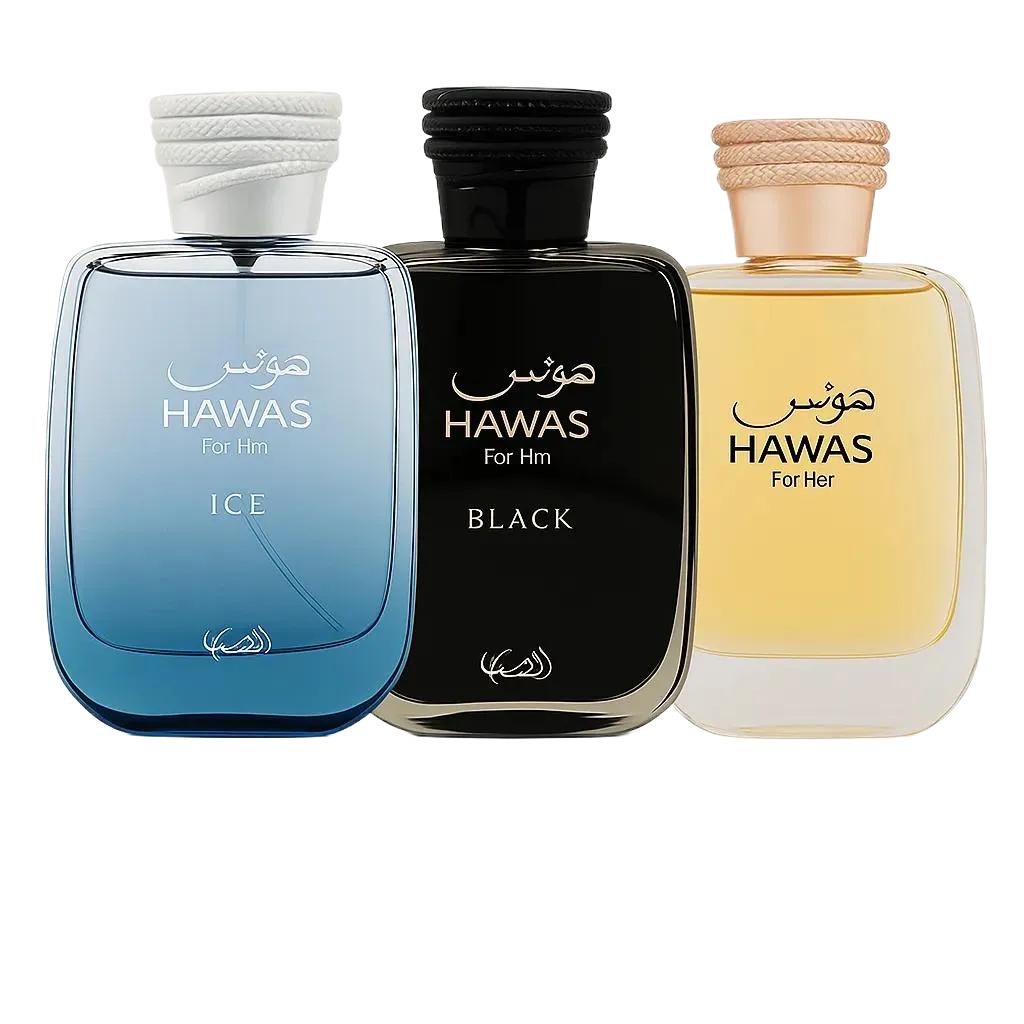 Discover the allure of the Hawas 3-Piece Eau de Parfum Set by Rasasi, featuring Hawas Ice, Hawas Black, and Hawas for Women.